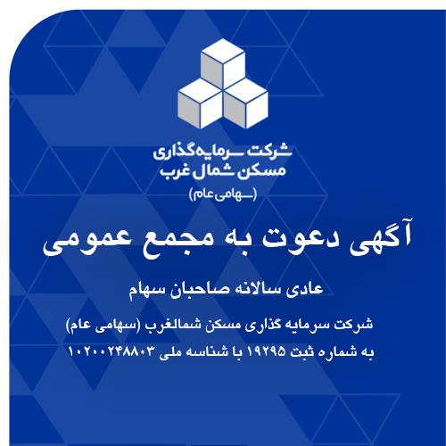 بدین‌وسیله به اطلاع سهامداران محترم شرکت سرمایه¬گذاری مسکن شمالغرب (سهامی عام) به شماره ثبت 19295 با شناسه ملی 10200248803 می‌رساند، مجمع عمومی عادی سالانه سال مالی منتهی به 1404/06/31 شرکت، ساعت 10:00 صبح روز چهار¬شنبه مورخ 1404/09/05 در محل سالن اجتماعات هتل پتروشیمی به نشانی: تبریز- گلکار- مجتمع پتروشیمی برگزار می‌شود.